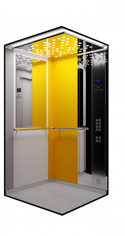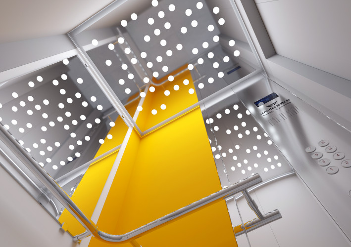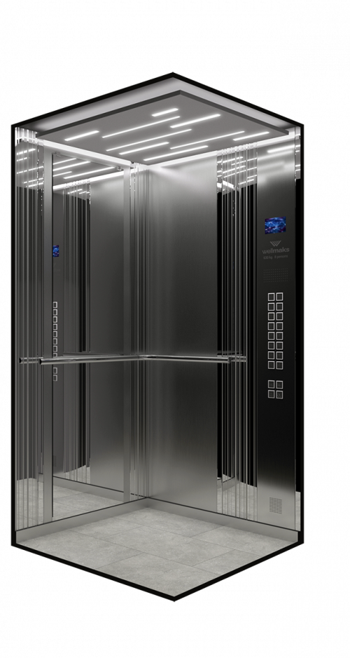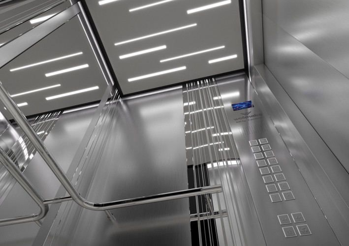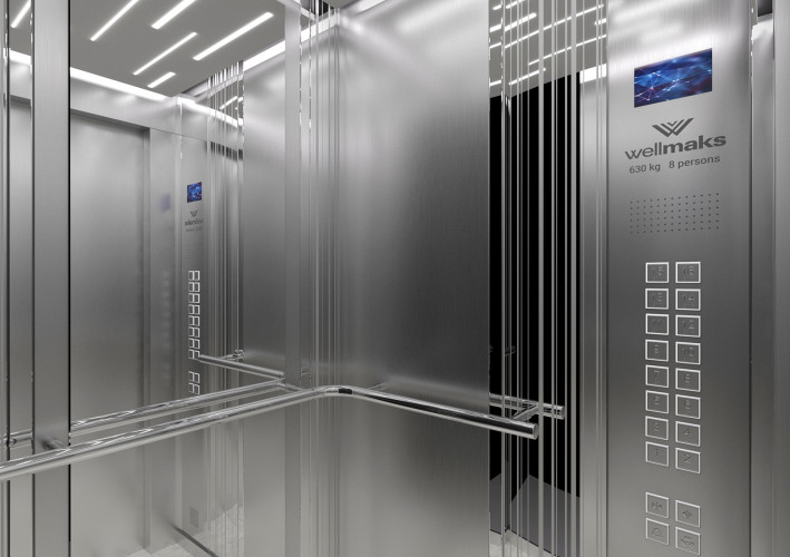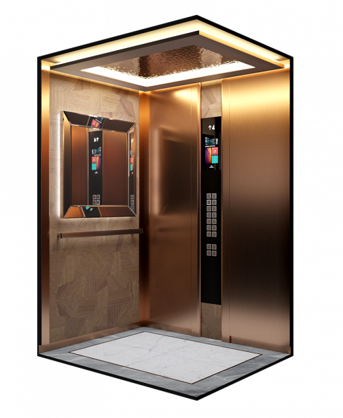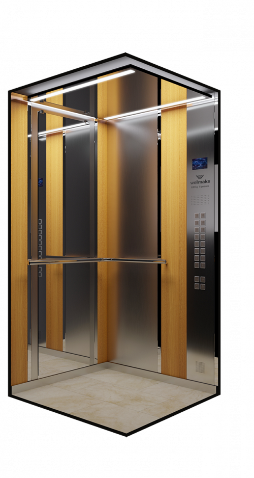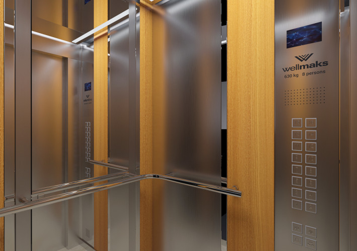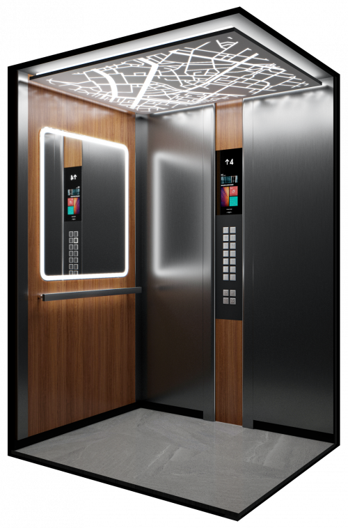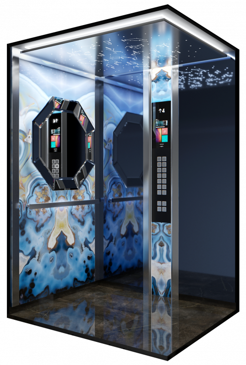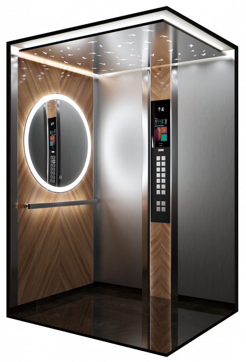 Данная модель сочетает в себе шлифованную и полированную нержавеющую сталь, темный камень и натуральное дерево. Панель из шпона эльдорадо с зеркальным рисунком, располагающуюся на задней стенке кабины, изящно дополняет круглое зеркало Ring с фронтальной и фоновой подсветкой.